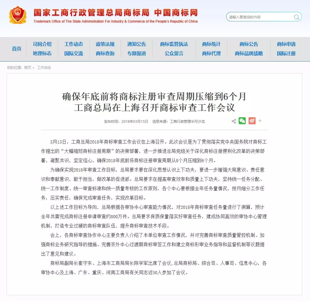 3月13日,工商总局2018年商标审查工作会议在上海召开。此次会议是为了贯彻落实党中央国务院对商标工作提出的“大幅缩短商标注册周期”的决策部署,进一步推进总局党组关于深化商标注册便利化改革的决策部署,凝聚共识,坚定信心,确保2018年底前将商标注册审查周期从8个月压缩到6个月。