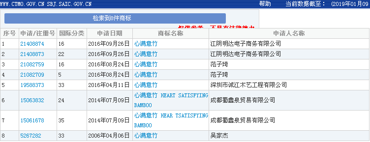 这里所指的“其他的注册情况”,经发思特在中国商标网查询获悉:“心满意竹”共计有8个商标申请信息,其中,仅有3个商标状态为授权。分别是范子琦于2016年8月24日申请注册的第16类和第5类商标,和成都蜀鑫泉贸易有限公司于2014年7月9日申请注册的第35类商标。