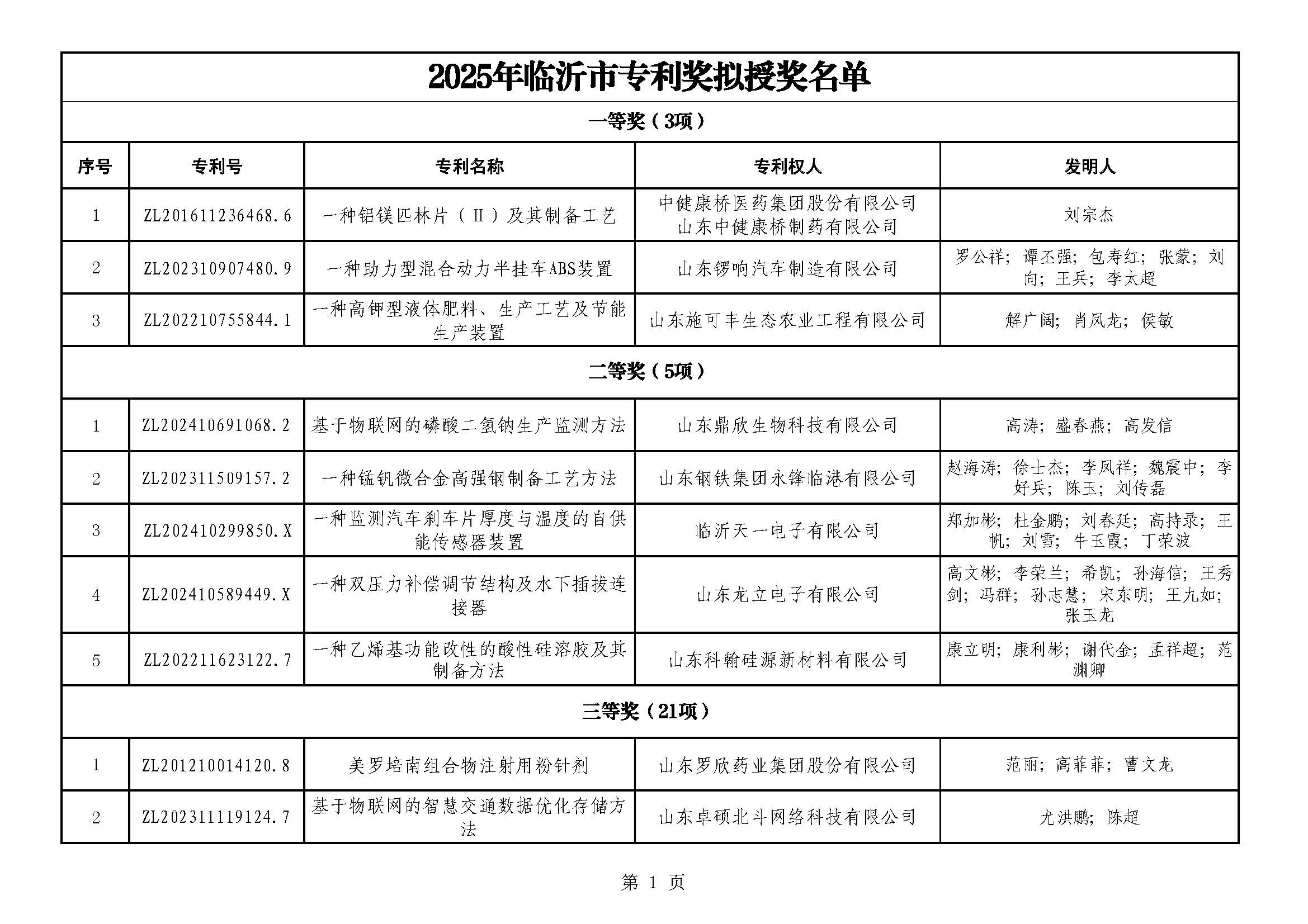 依据《临沂市专利奖励办法》等有关规定,现将2025年临沂市专利奖拟授奖名单予以公示,其中一等奖3项,二等奖5项,三等奖21项。公示期为5个工作日,自2025年11月11日至2025年11月17日。